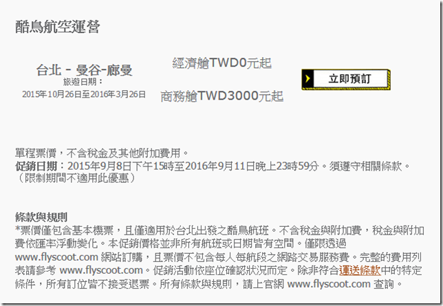 【訂票日期】2015年9月8日下午15時至2016年9月11日晚上23時59分。須遵守相關條款。(限制期間不適用此優惠)